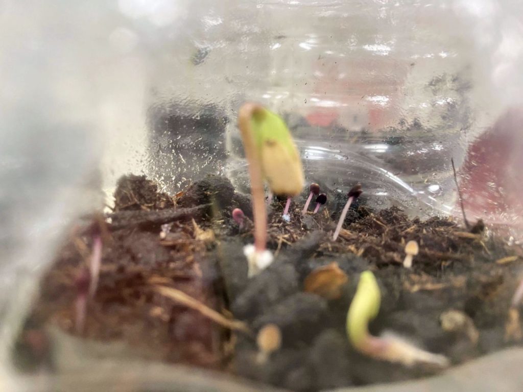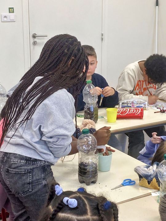 Grande surprise quelques jours plus tard : en arrivant en classe, les enfants ont découvert des plantules dans toutes les bouteilles ! Un véritable moment d’émerveillement collectif qui a permis de concrétiser la notion de germination.