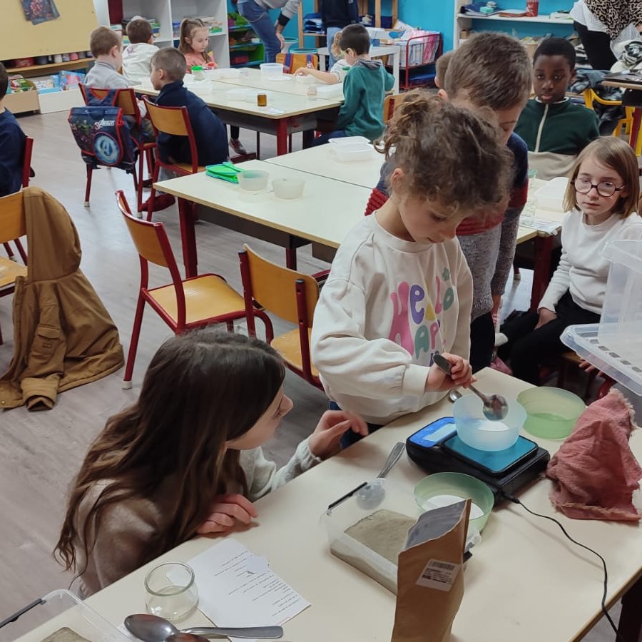 Les élèves ont ensuite pesé, mélangé… et même goûté leur fabrication avec beaucoup d’enthousiasme !